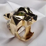 A timeless icon of fine jewelry, this 18-karat yellow gold panther ring by Cartier embodies power and wild elegance. Sculpted with remarkable precision, the panther's head stands out with its bold, geometric design, enhanced with black lacquer details that evoke the animal's spotted coat. Its piercing gaze is highlighted by two natural, vibrant green peridots, while the onyx nose adds a touch of depth and mystery to the feline expression.