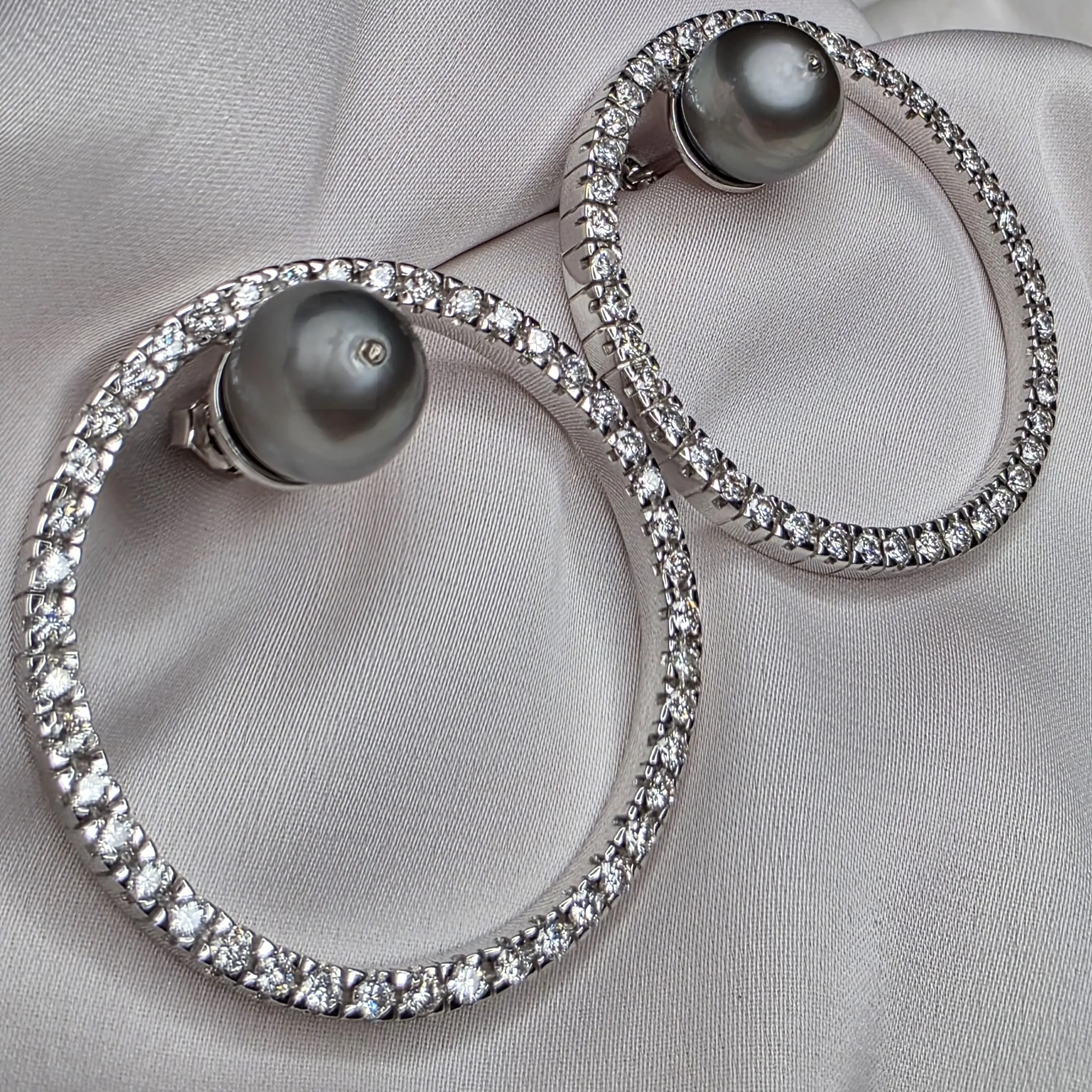 18k White Gold Hoop Earrings with Diamonds and Tahitian Pearls – Butterfly Clasp